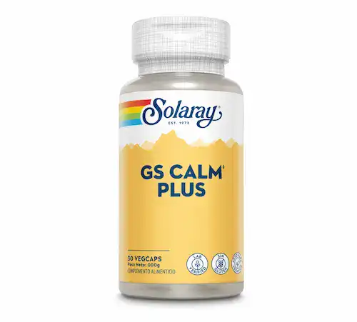 GS Calm Plus de Solaray, es un complemento alimenticio a base de extracto de semilla de Griffonia (con un 30% de 5-HTP), extracto de estigmas de azafrán y ácido fólico.